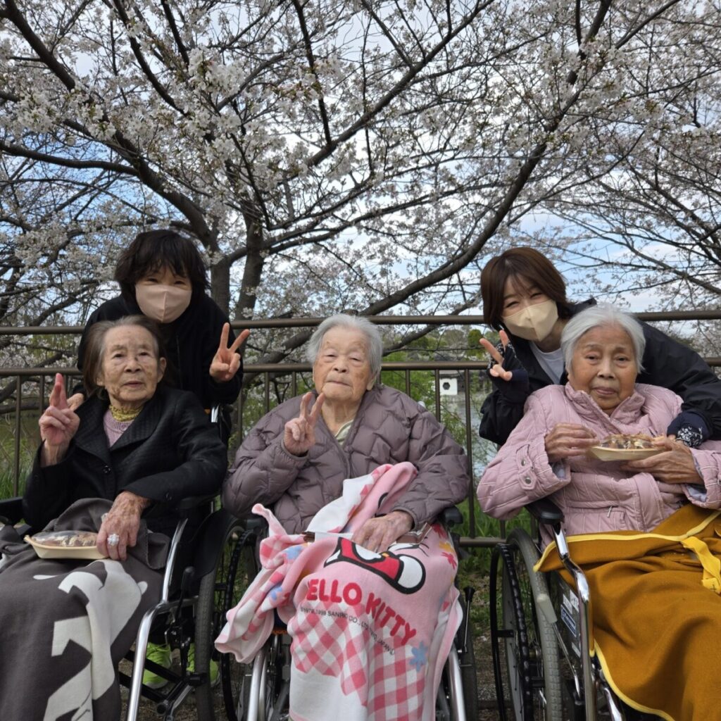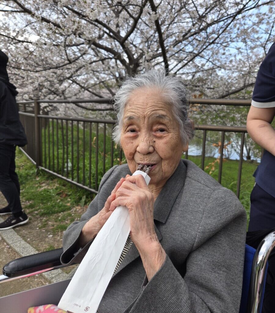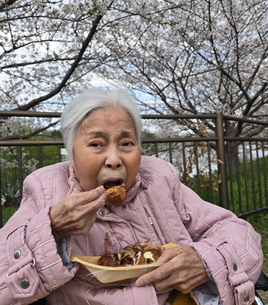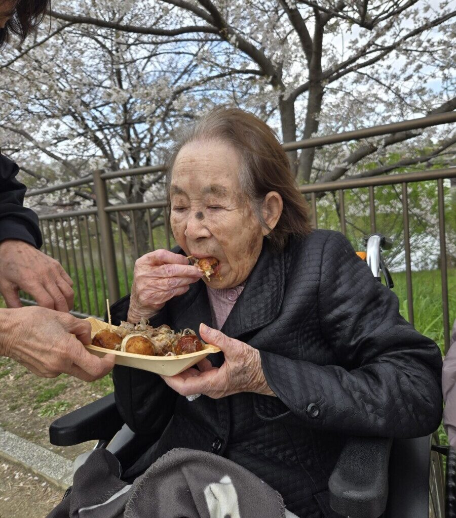 🌸 鶴見緑地へ花見🌸② 2026/04/02 今日は6名で、お花見へ出発しました。 満開の桜の中、 たこ焼きやポテト、チュロスなどを召し上がり、 春のひとときを楽しまれていました🌸😊 少し肌寒さも感じられましたが、 温かい食べ物で体も温まり、 桜の下でいただくことで、より一層おいしく感じられたご様子でした。 季節を感じながら、 ゆったりとした時間を過ごすことができました👌